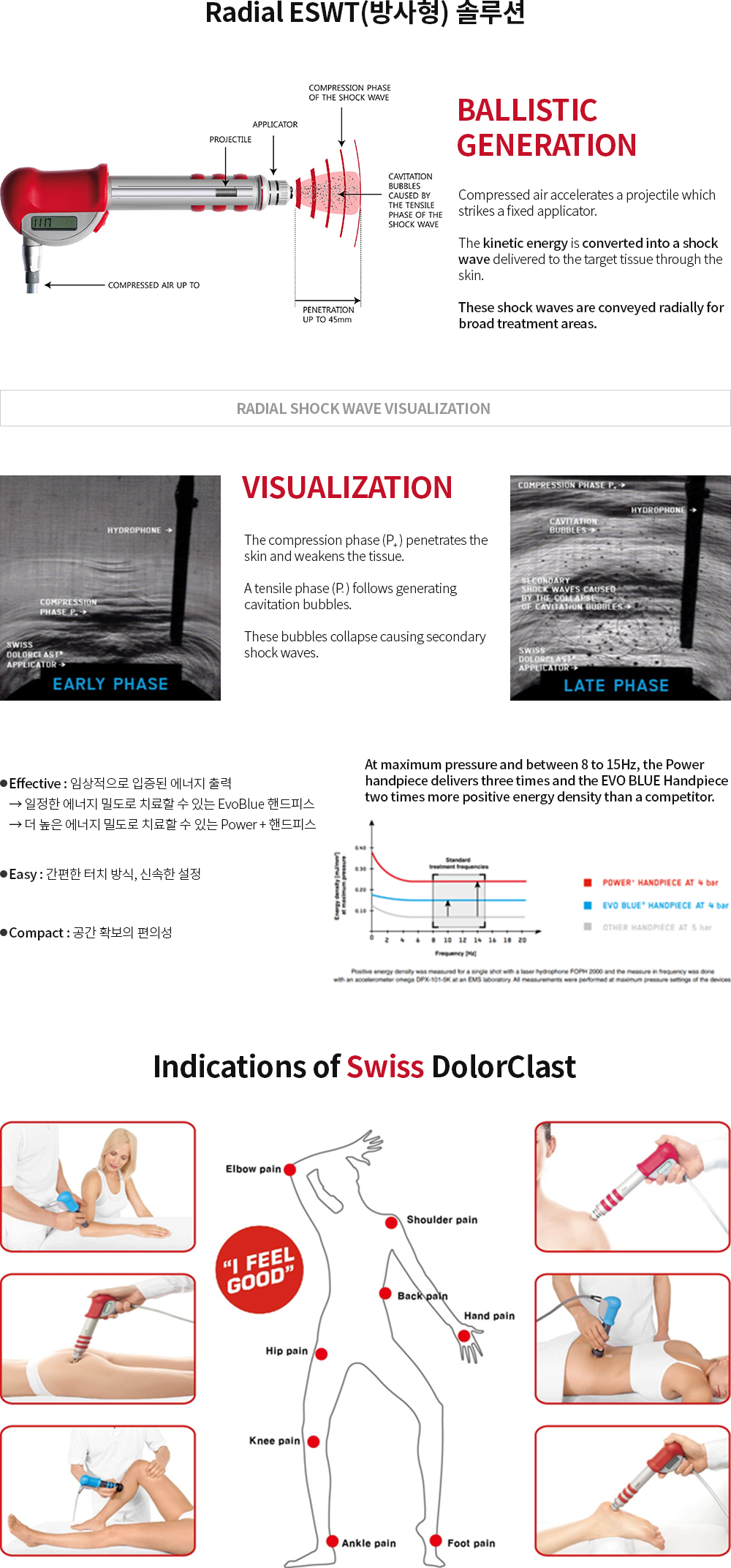 Swiss DolorClast Smart20은 Radial ESWT(방사형) 솔루션으로 충격파를 인체에 전달하여